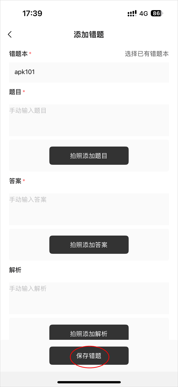 4、输入错题内容点击保存错题即可
