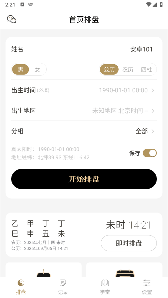1、进入软件首页输入自己的相关信息点击立即排盘