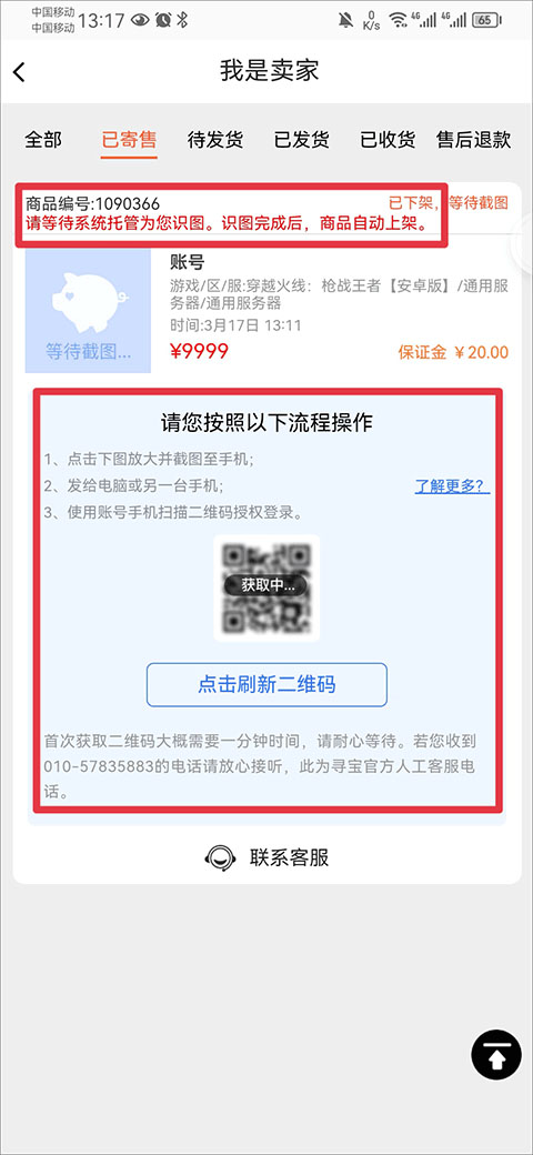 8、最后在已寄售界面内按照提示操作,并等待系统托管客服为您识图,识图完成后商品会自动上架。