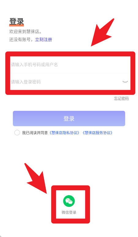 1、在登录页面红框区域输入手机号或用户名及密码即可登录,也可选择微信登录方式,快速进入系统。