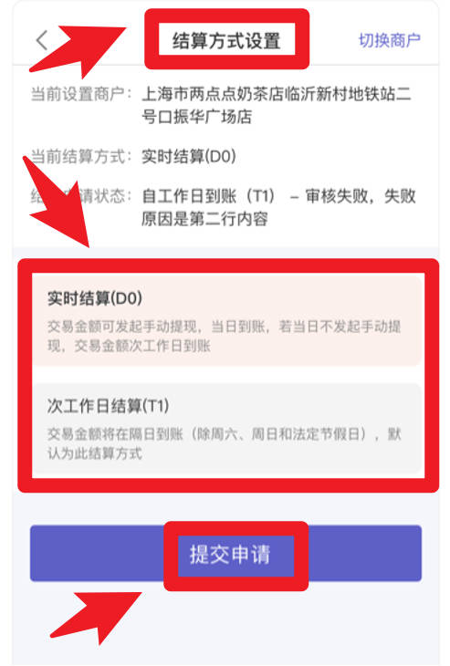 4、在结算方式设置界面可选择实时结算或次日结算,并点击提交申请完成设置,确保资金按需求到账。