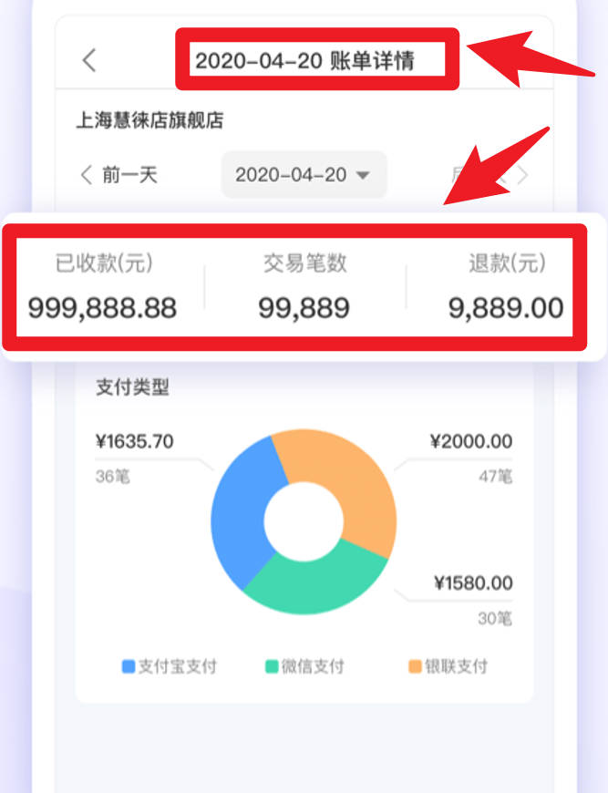 3、在账单详情页面可以查看每日收款金额、交易笔数及退款金额,并通过图表清晰分析支付宝、微信等支付占比。