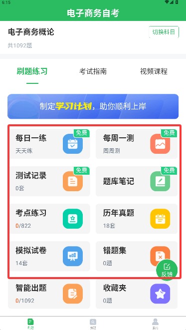 2、丰富的练习与做题模式:电子商务自考题库APP有模拟考场、历年真题练习、快速练习、考点练习、做题记录等多种学习与做题模式、丰富多样化的陪你一起考电子商务自考。