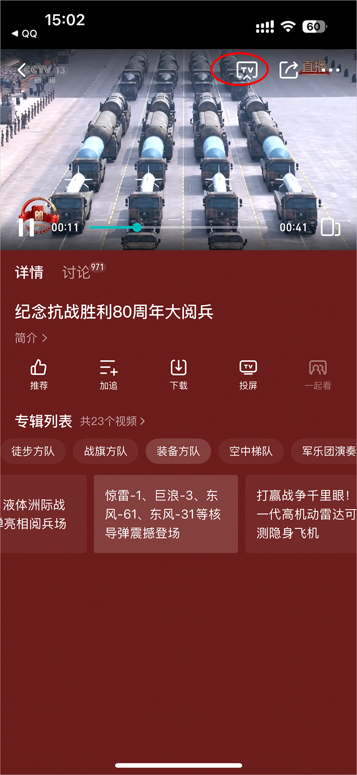 2、进入播放界面点击右上角的tv图标