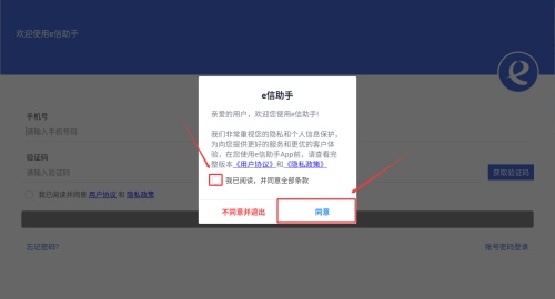 1、首次启动时,请仔细阅读并勾选同意用户协议,随后进入登录界面。