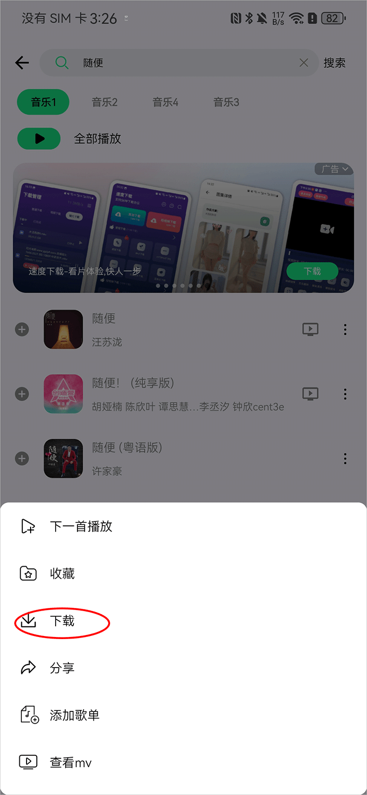 3、点击你要下载的那首歌曲后面的三点图标