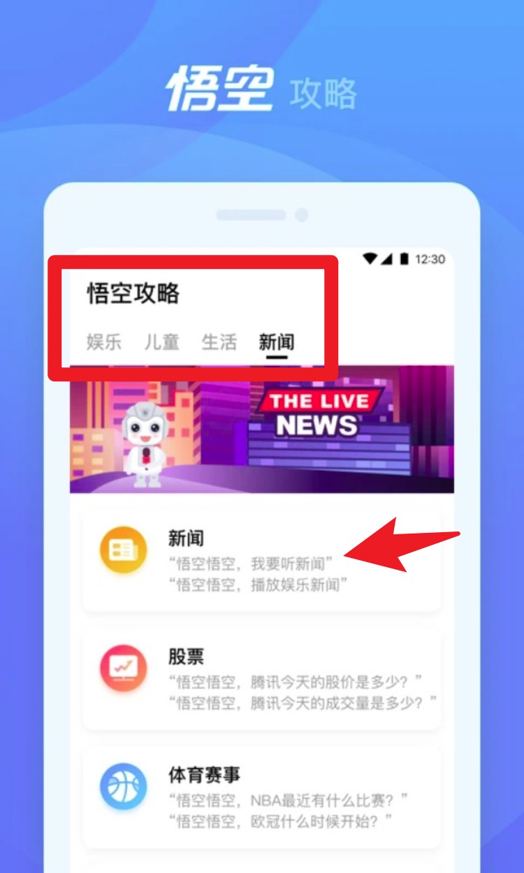 3. 前往「悟空攻略」版块,切换到「新闻」标签后,即可通过语音指令播放今日新闻、股市、体育赛事等资讯内容,边听边学。