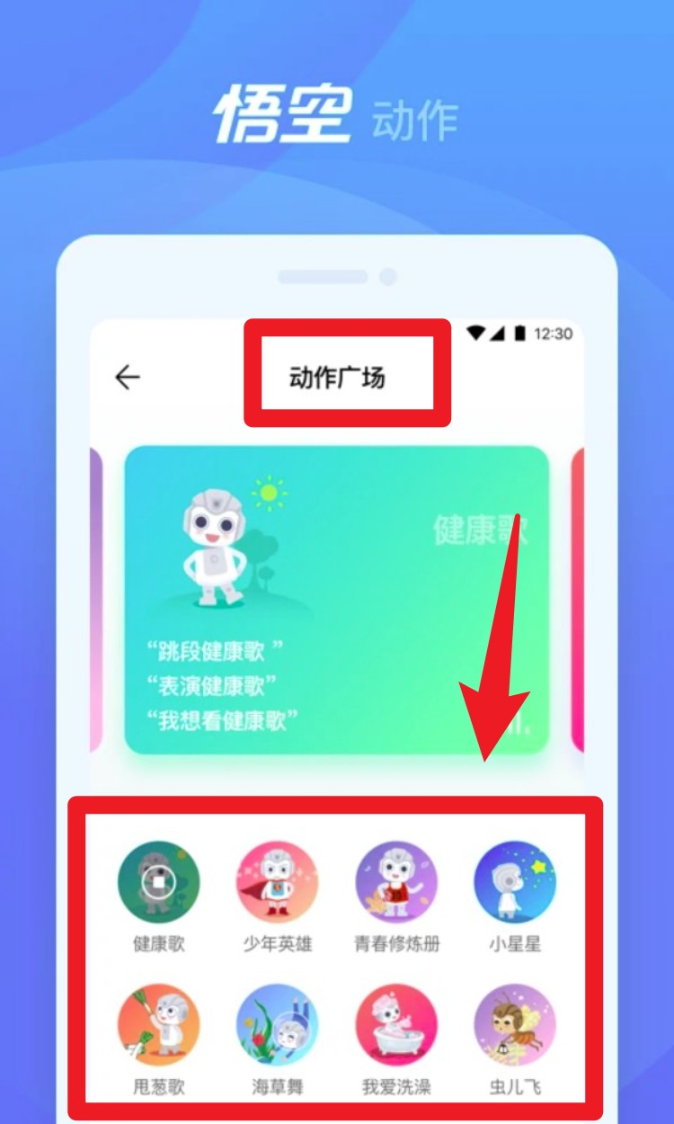 1. 进入首页点击「动作广场」,可选择如《健康歌》《我爱洗澡》等动作歌曲,让机器人跟着节奏舞动,陪伴孩子一起活动身体。