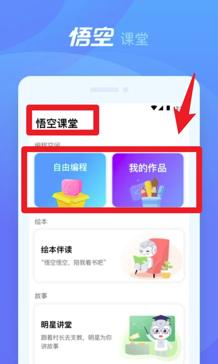 2. 在「悟空课堂」中点选「自由编程」或「我的作品」,孩子可进行简单逻辑搭建,也能上传自己的语音或图片进行创意展示。