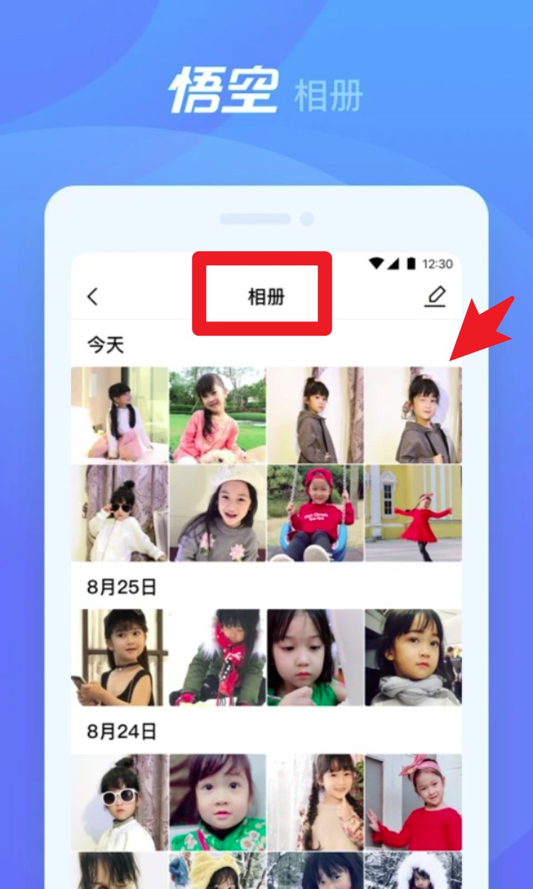 4. 点击「相册」模块可查看孩子日常拍摄的照片,依照日期自动分类,支持浏览、删除与同步保存至家长设备中。