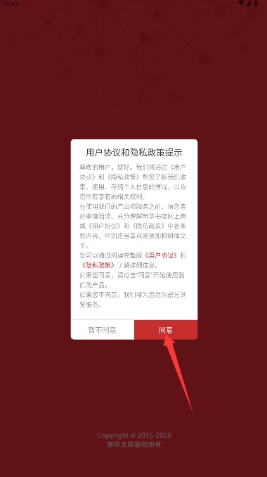 1、打开应用后仔细阅读用户协议和隐私政策,确认后点击同意按钮进入应用。