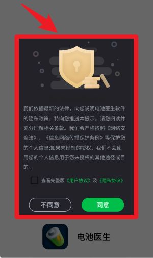 1、首次启动电池医生时,会弹出隐私协议和用户协议提示,用户需认真阅读并选择同意或不同意,以保障个人信息安全。