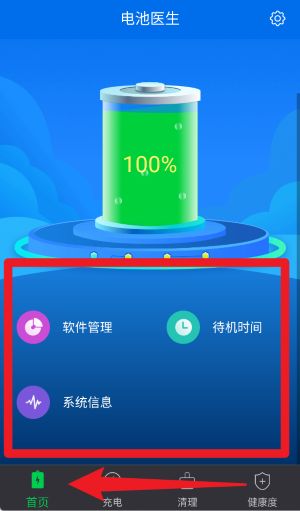 2、在首页界面,用户可查看电池实时电量,并进入软件管理、待机时间和系统信息等功能模块,全面掌握电池运行状况。