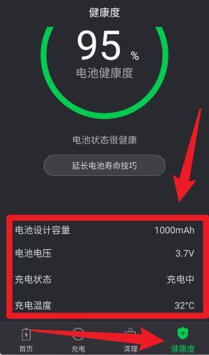 5、在健康度界面,用户能直观查看电池健康百分比及设计容量、电压、充电状态和温度等数据,便于科学管理和维护电池。