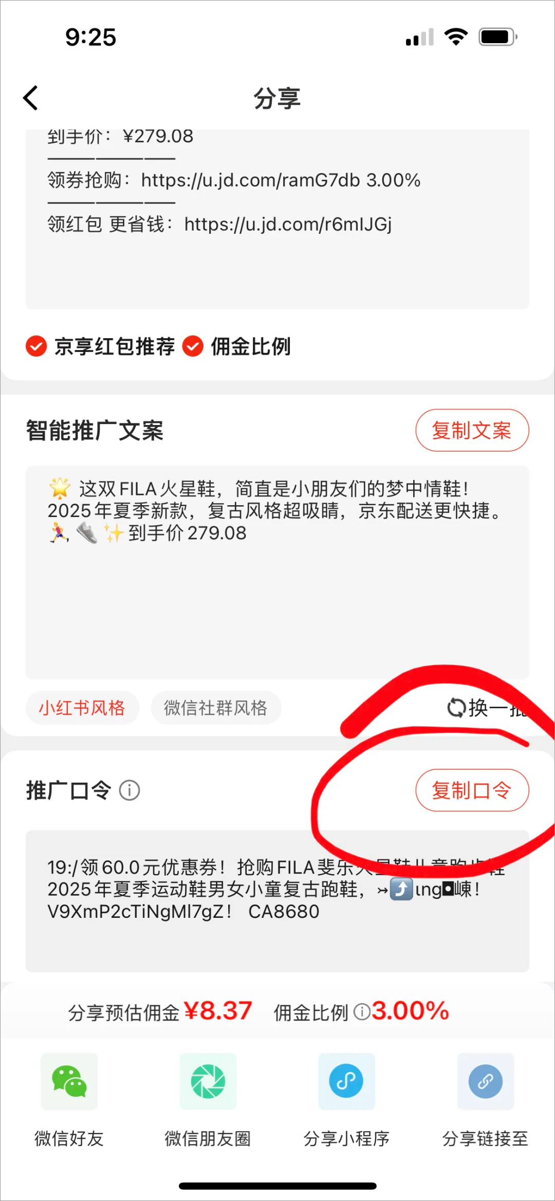 4、将在京粉app中复制的口令链接分享至其他平台,进行推广后就可以前往京粉app中的佣金页面中进行佣金提取