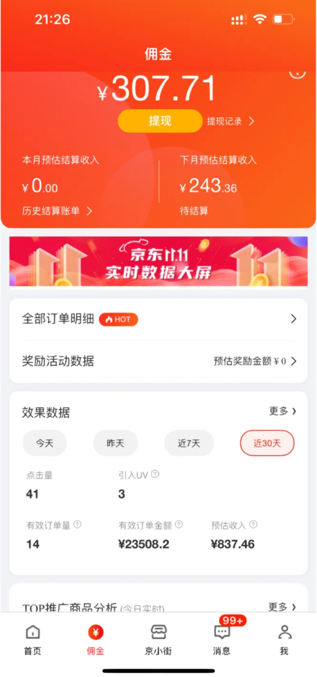 实时反馈您的推广数据。点击首页下方"佣金",可查看您的收入及推广数据情况。