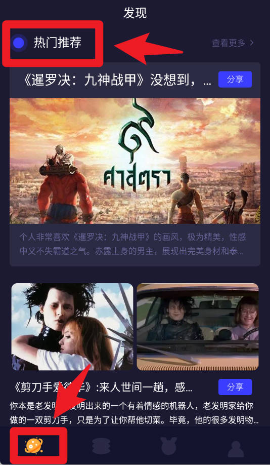 1、在发现页面,可以通过热门推荐快速获取最新影视资讯,点击下方图标即可进入不同推荐模块,轻松找到感兴趣的影片内容。