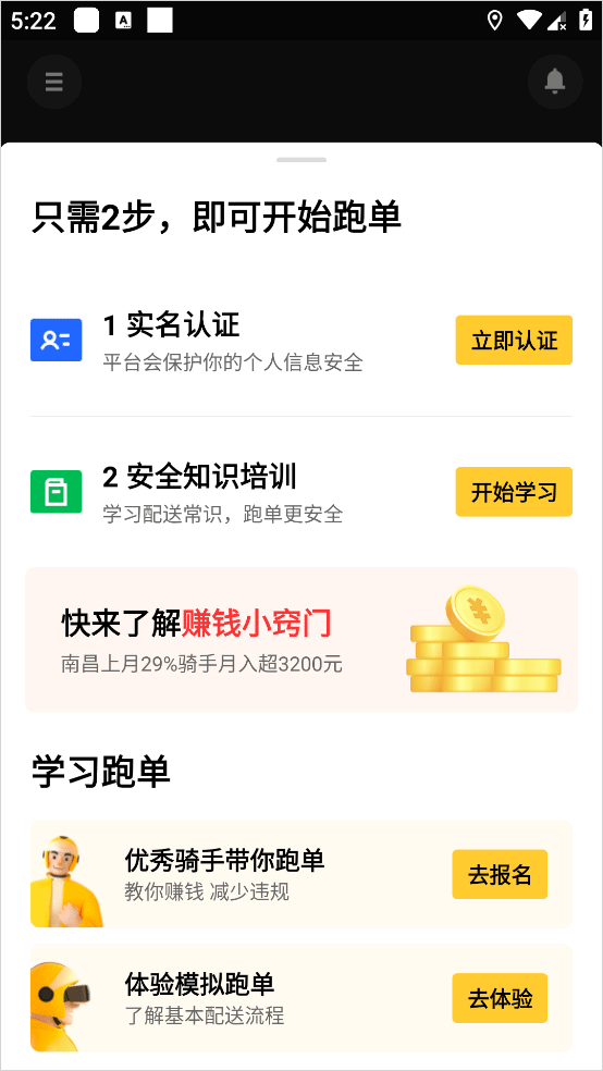 1、首次注册登入账号需要通过实名认证和安全知识培训才可以开始接单