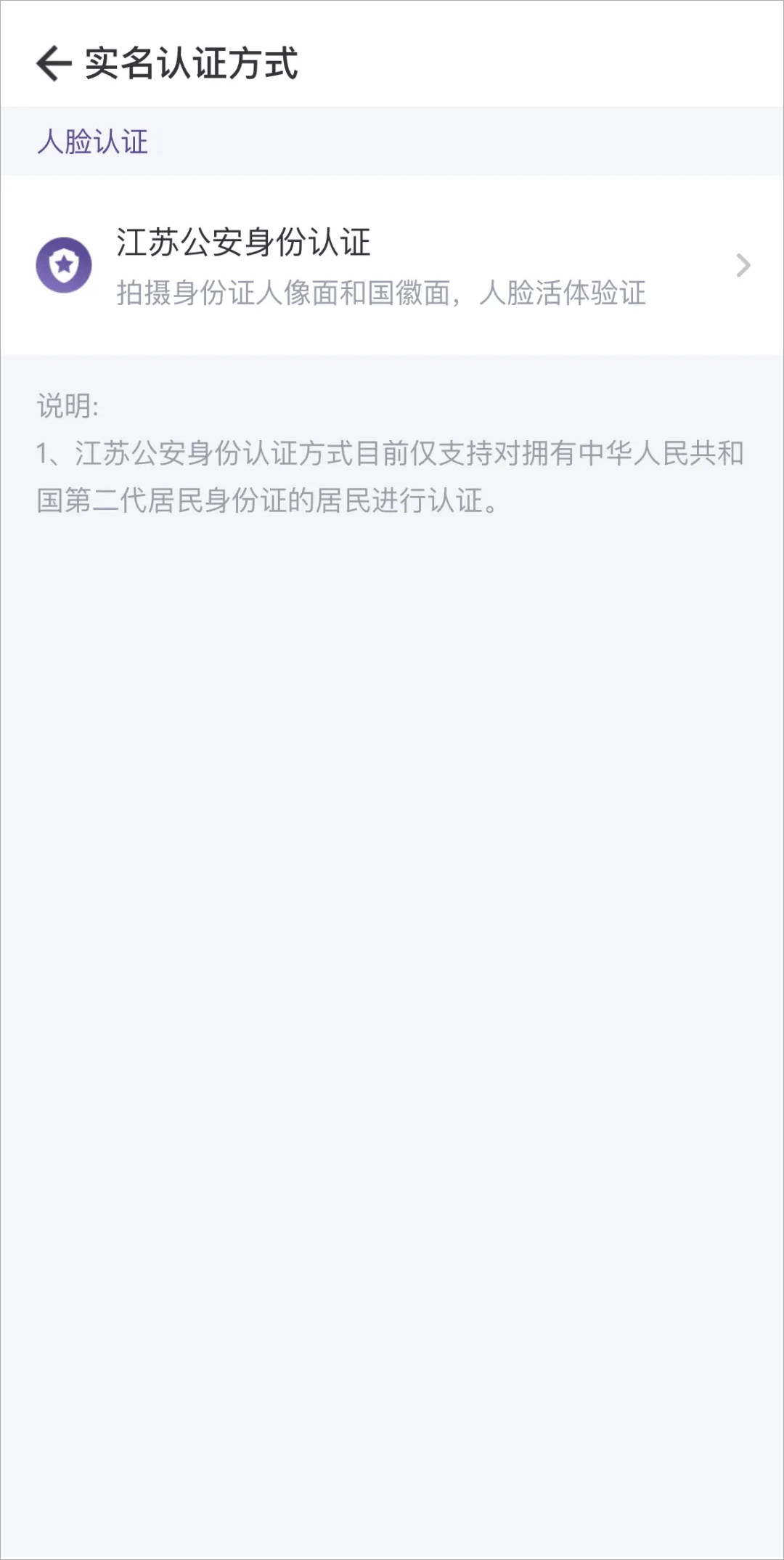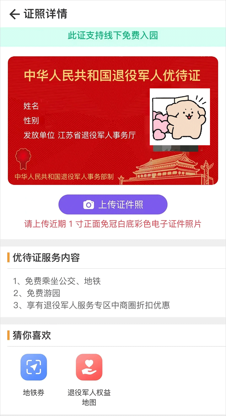 4、上传江苏省二代居民身份证正反面完成实名认证,目前身份认证仅限于江苏省省内退役军人优待证持证人;