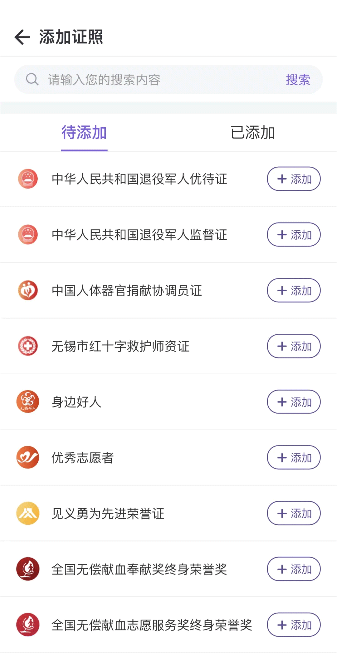 7、选择待添加中“中华人民共和国退役军人优待证”;