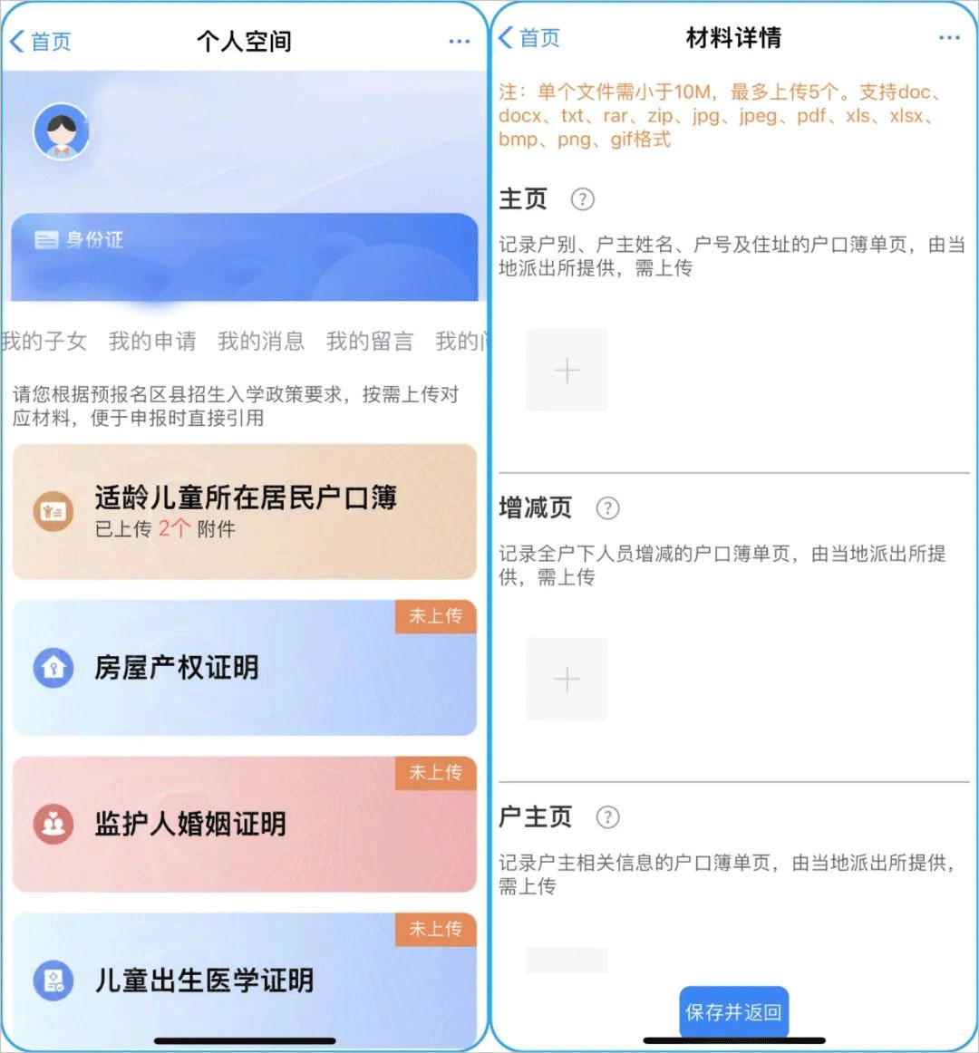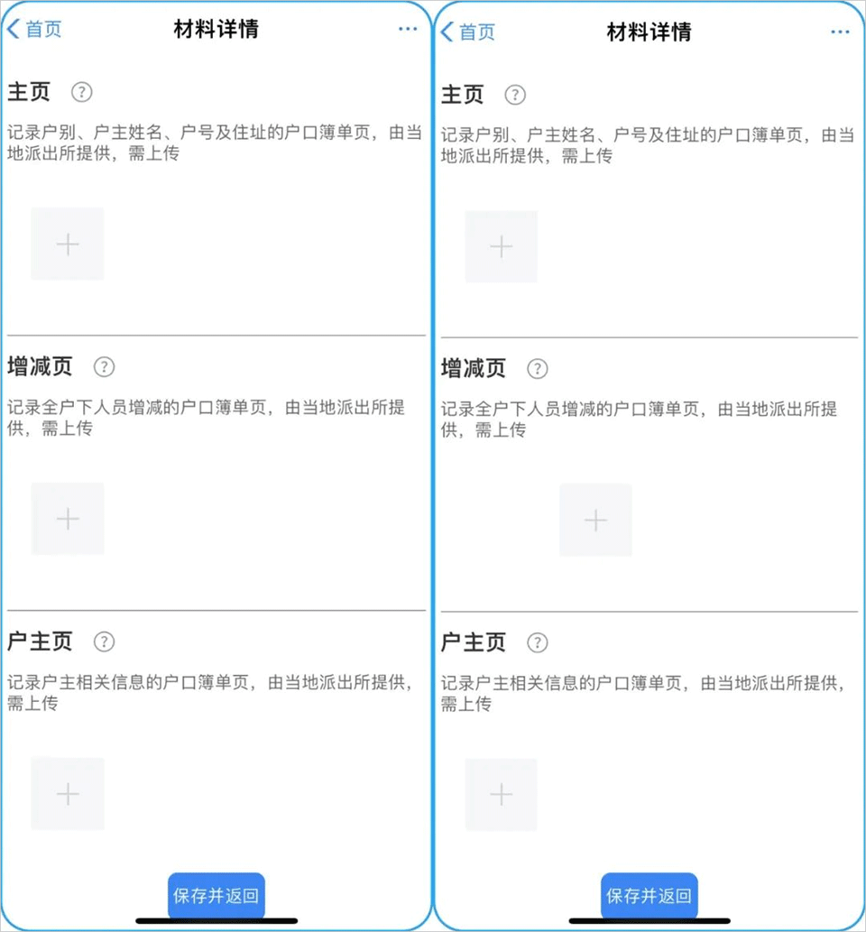 点击材料名称下的“+”按钮,则可选择您准备好的材料照片进行上传。完成所有细分材料上传后,点击“保存并返回”,完成户口簿材料上传,其他需要维护的材料参照此流程即可。