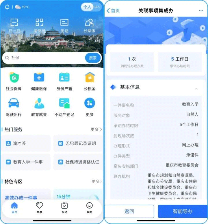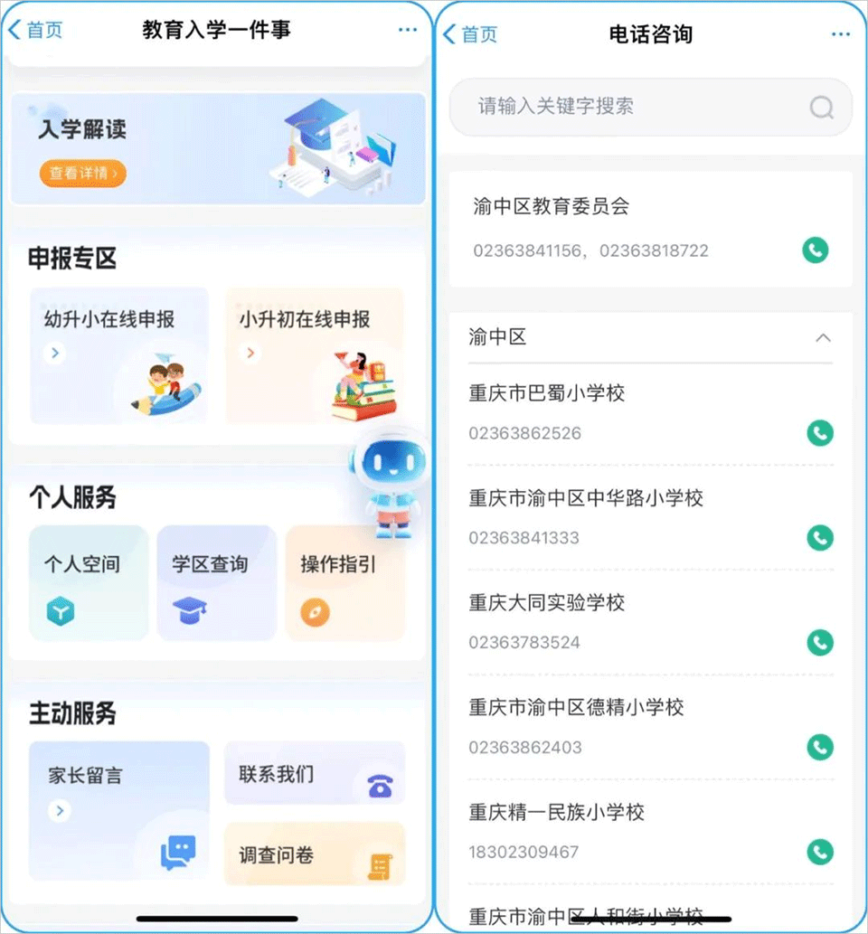 1、打开重庆市政府渝快办APP,选择首页的“热门服务”-“教育入学一件事”,点击“智能导办”选择您要报名学校的区域,进入重庆市义务教育招生报名系统。
