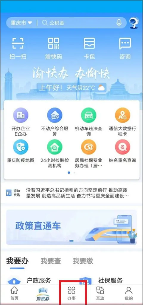 1、下载安装渝快办app官方最新版,打开软件进入首页,点击下方办事按钮
