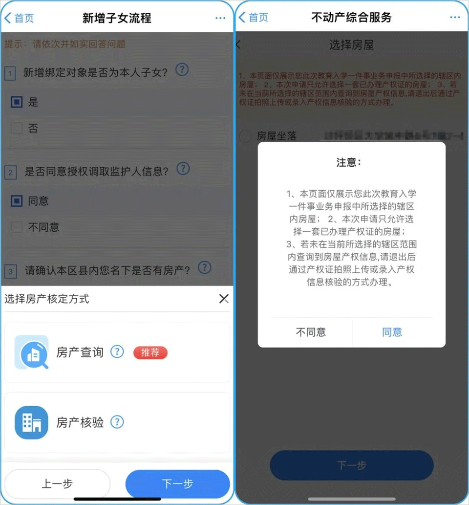 3、选择好预报名的子女,点击“确认”后进入房产核验流程,可选择两种不动产核定方式,这里以“房产查询”方式为例。