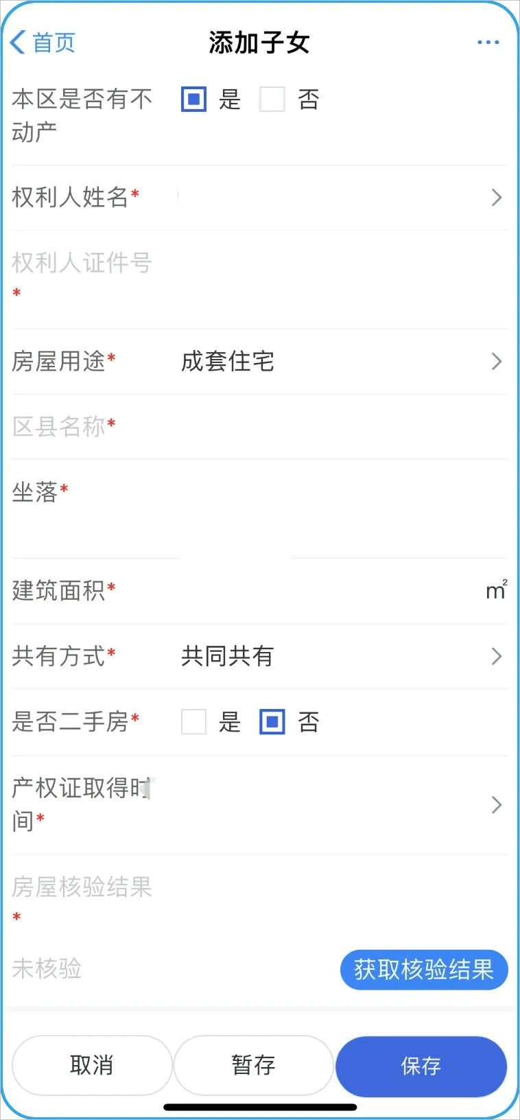确认实际居住地址后,下滑显示其他表单,完善监护人电话信息和房产相关信息。若不动产核定方式为“房产核验”方式,子女基本信息和监护人信息维护方式相同。