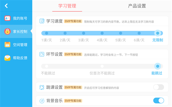 家长可依据儿童的拼音水平管理学习进度、环节和使用时长。还可自行在拼音库中“打印拼音”,让儿童线上线下结合学习。