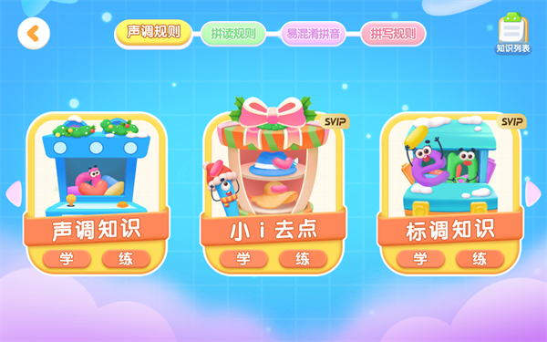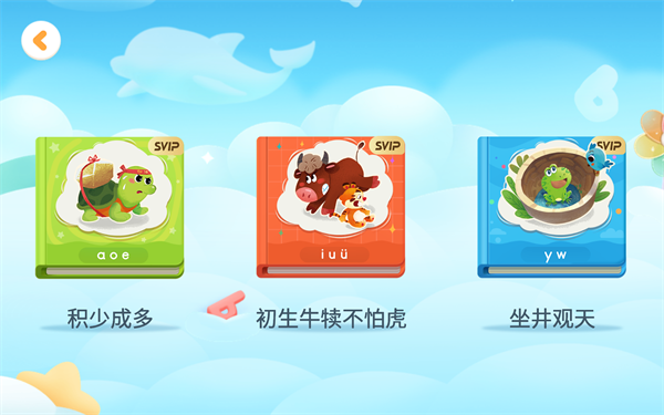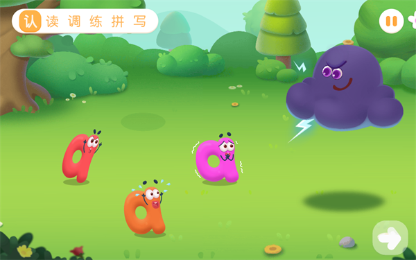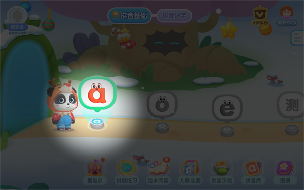 [宝宝拼音乐园]的500+个趣味检测覆盖拼音字母中的认、读、调、写、拼、练六个维度,帮助宝宝巩固拼音知识。