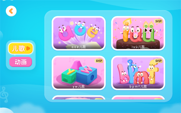 宝宝巴士的[宝宝拼音乐园]在拼音启蒙的内容编排上,将拼音字母划分为单韵母、声母基础、声母进阶、复韵母、鼻韵母、整体认读,带领宝宝在拼音启蒙的过程中循序渐进掌握拼音知识。