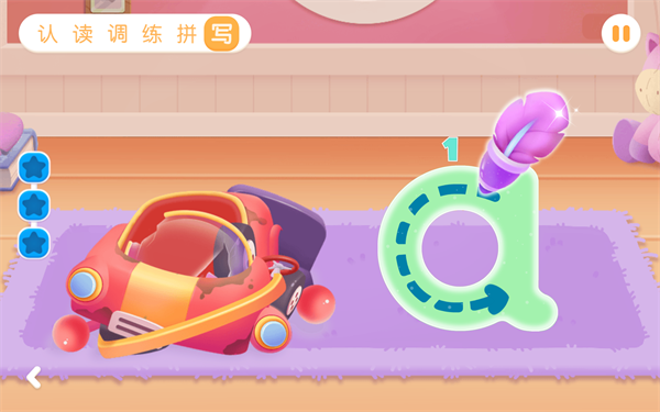 2、主要过程是通过认、读、调、练、拼、写六个步骤,中间穿插着动画和小游戏,很是吸引小朋友的注意。