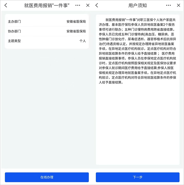 1、打开“皖事通”APP,在搜索框搜索“高效办成一件事”,找到“就医费用报销一件事”,点击进入。阅读办理详情页后,点击【在线办理】按钮进入“用户须知”“情形引导”页面。