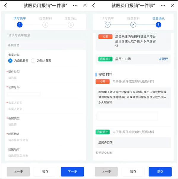 4、材料全部上传完成后,点击【下一步】,进入到信息确认页面。核查确认已填写表单信息和材料信息,提交申报即可。