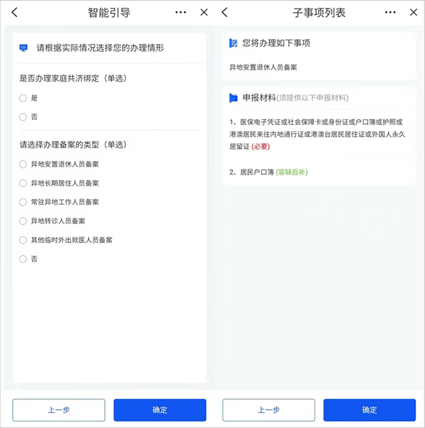 2、根据自身情况选择备案的类型,点击下方的【确定】按钮,此时页面会弹出需要办理的事项列表与需要上传的材料信息,点击【确定】按钮。
