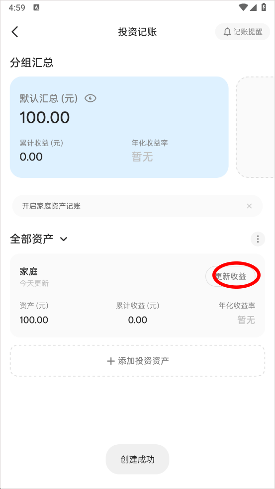 5、填写完之后就会出现这样一个界面,用户可以随时通过[更新资产]更新投资资产内容