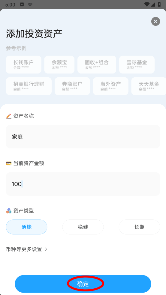 4、编辑资产名称、金额以及类型点击【确定】