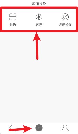 3、点击底部中间的“加号”按钮后,可选择扫描、蓝牙或设备搜索方式添加智能硬件。
