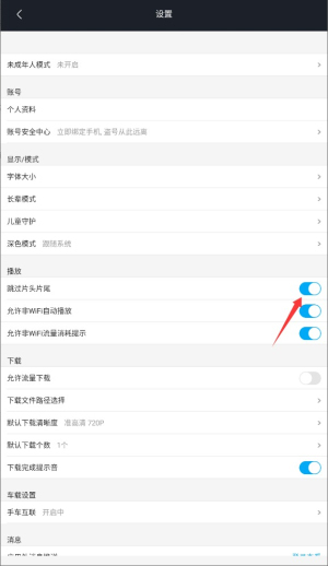 4、找到"跳过片头片尾"开关按钮,点击开启即可自动跳过视频开场片段。