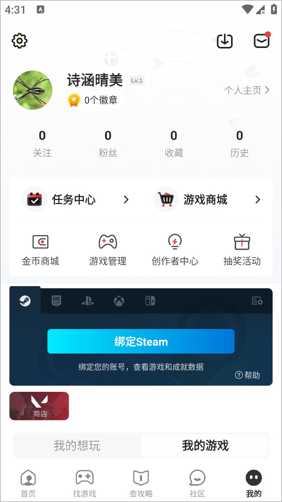 3、有趣的游戏社区:分享自己的游戏生活,还可以绑定Steam、Eoic、PSN、Xbox游戏账号,分享自己的游戏卡片,与全国《无畏契约》《怪物猎人》《黑神话悟空》等游戏爱好者交友畅聊。