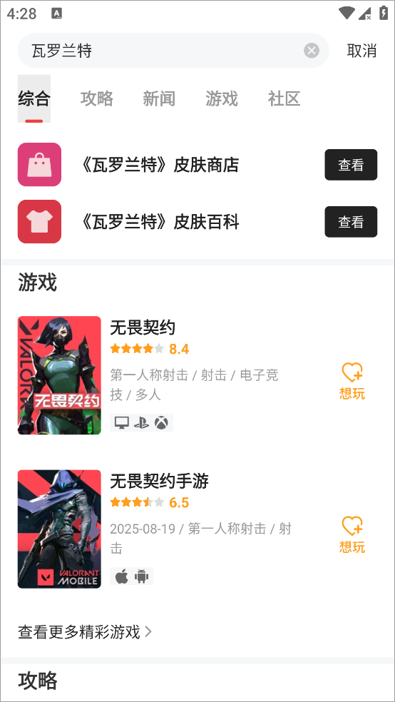 1、首先打开app后直接搜索瓦罗兰特点击皮肤商店,进入瓦罗兰特专区