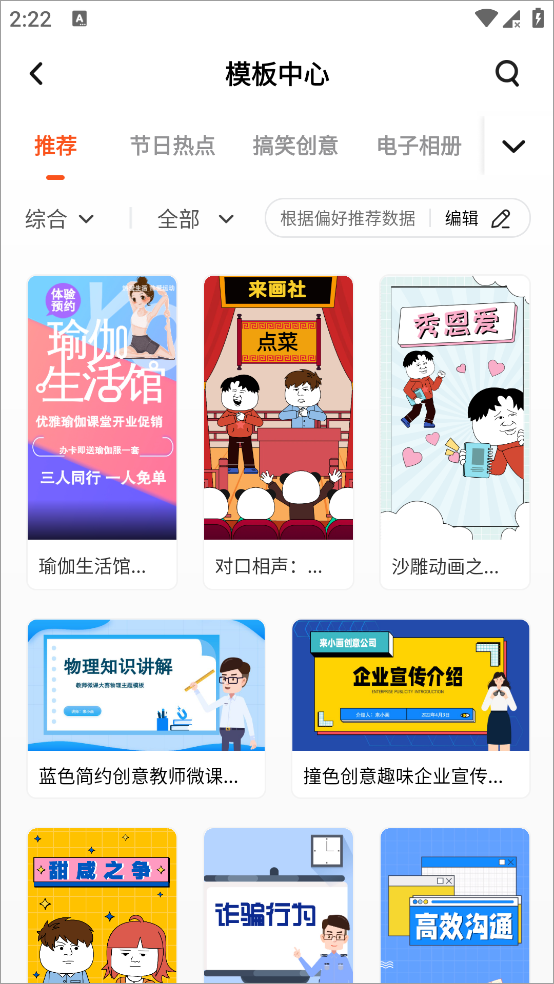 6、点击“模版中心”可以挑选使用已经做好的动画模版进行制作调整