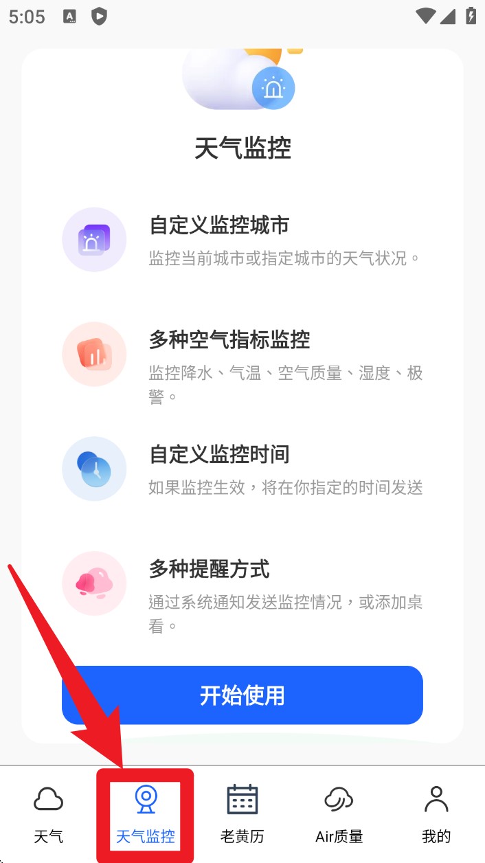 2. 点击底部“天气监控”栏目,可设置指定城市、多项空气指标及自定义时间的天气提醒。