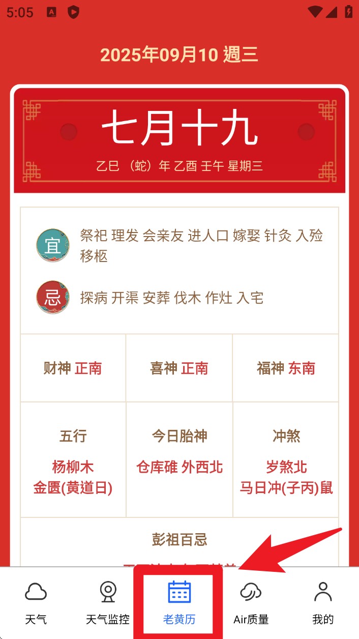 3. 切换到“老黄历”页面,即可查询今日宜忌、五行、冲煞、胎神等传统日历资讯与运势。