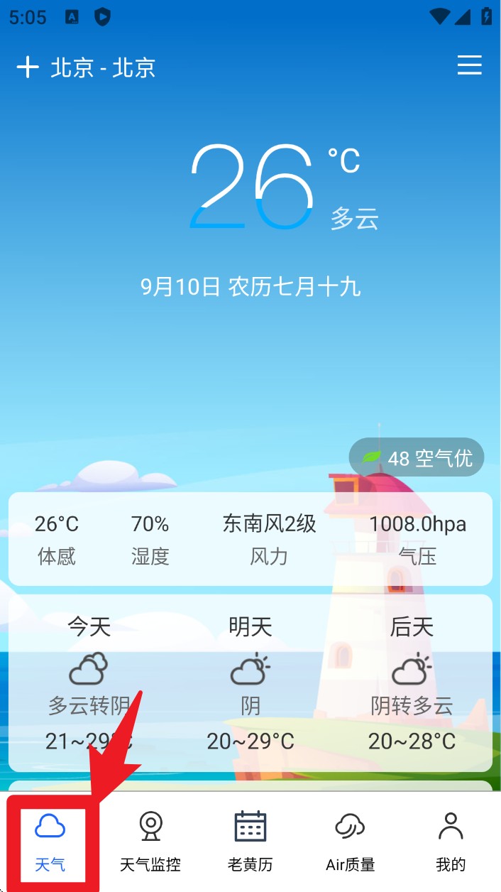 1. 进入 App 后默认显示“天气”页面,可查看实时温度、体感、湿度、气压等天气数据。