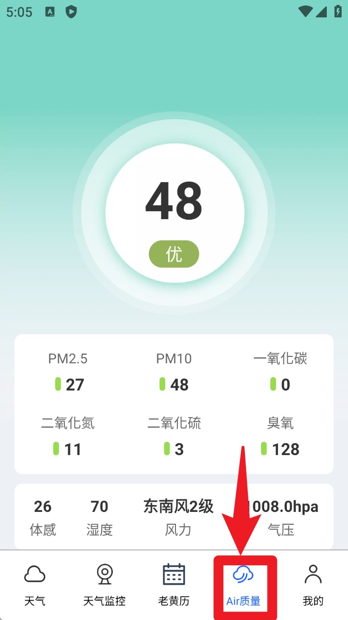 4. 点选“Air质量”栏目,可查看PM2.5、PM10 等各项空气指标与空气优良等级的实时数据。