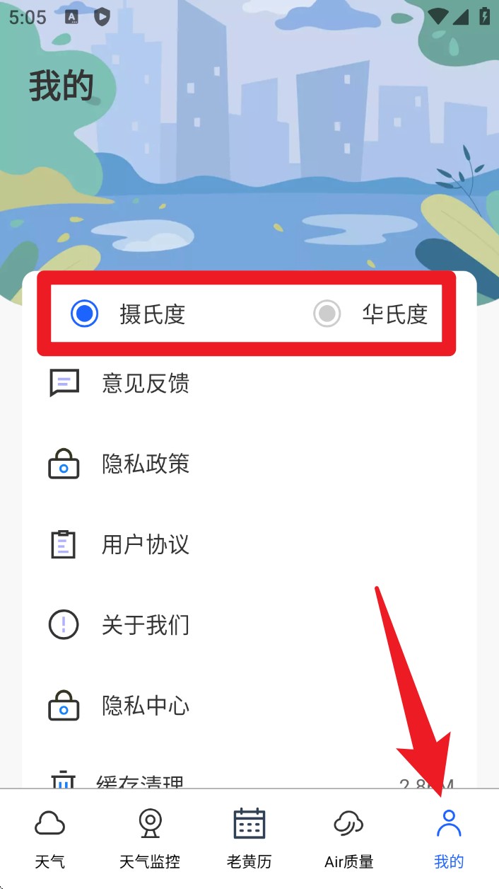 5. 在“我的”页面中可切换摄氏度/华氏度,并查阅用户协议、隐私设置与清除缓存功能。