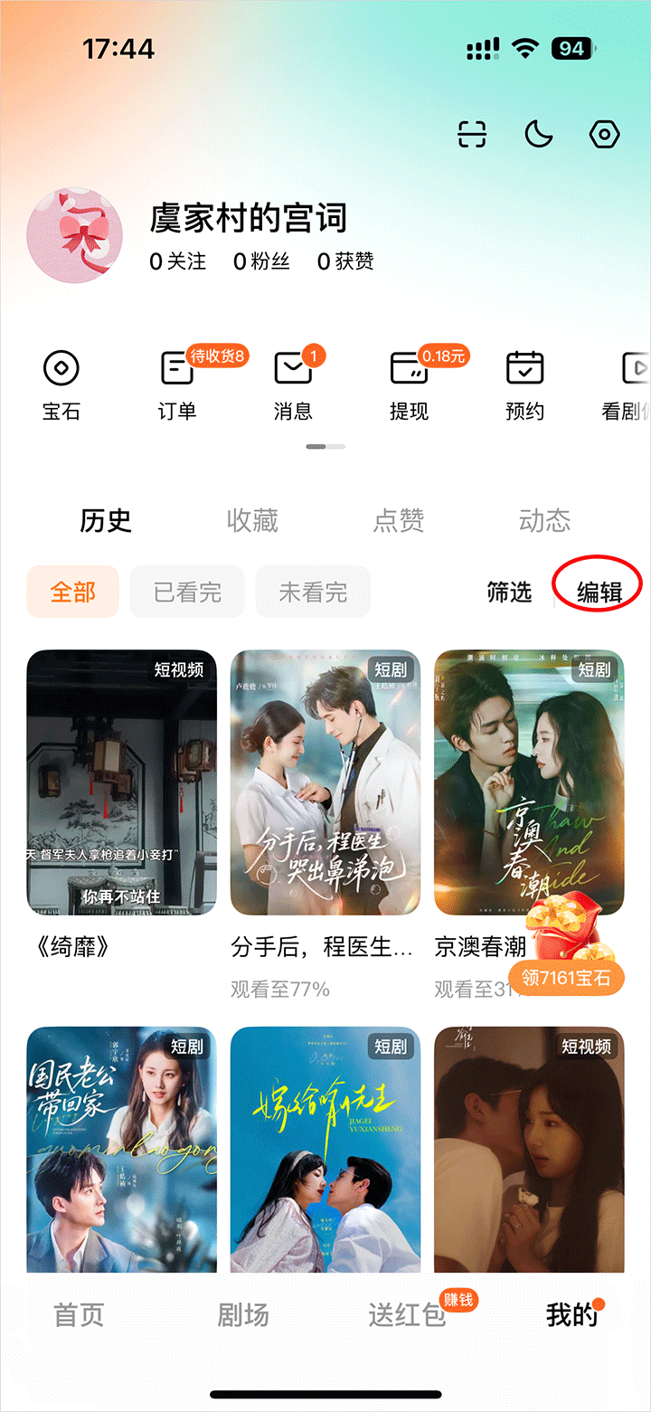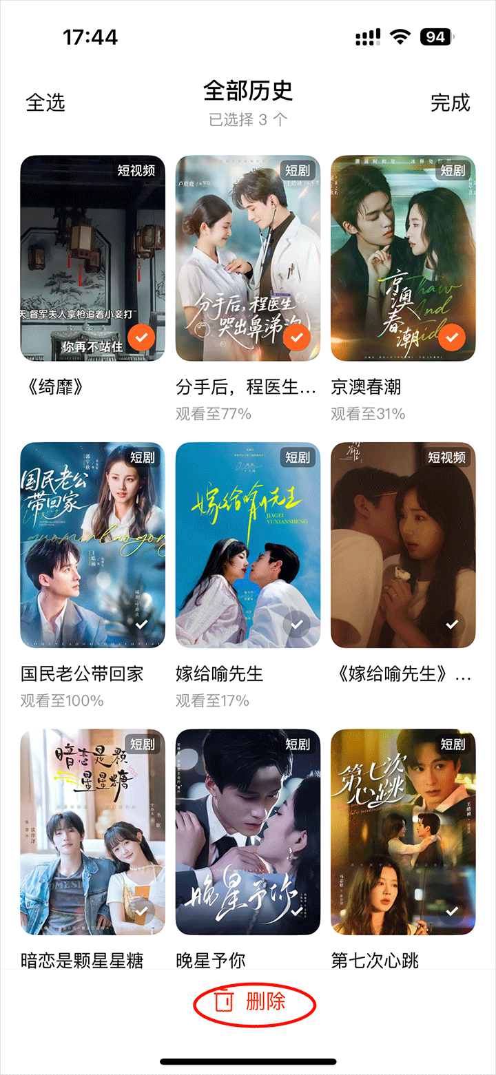 3、选择你需要删除的短剧即可,还可点击左上角全选之后删除