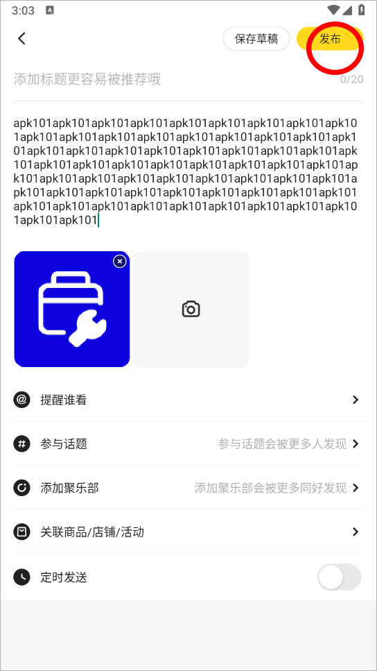 5、输入你要发布的文案及添加图片点击右上角的发布即可